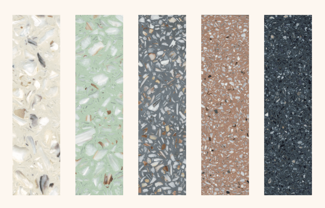 On peut citer l’entreprise Ostrea qui a créé un éco-matériau, du même nom, similaire à du marbre ou à du terrazzo. Les coquillages sont récupérés, transformés en paillettes, puis en plaques pouvant être utilisées pour créer des plans de travail, des revêtements de sol, ou même des plateaux de mobilier.