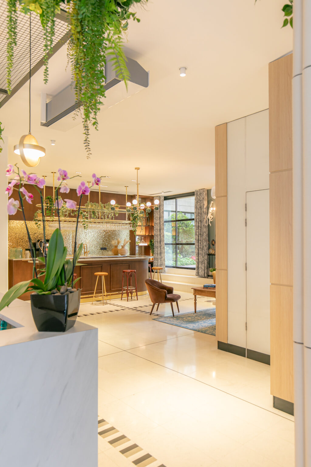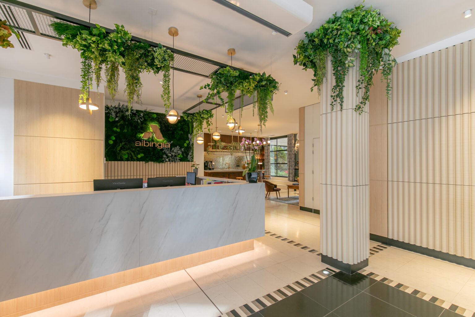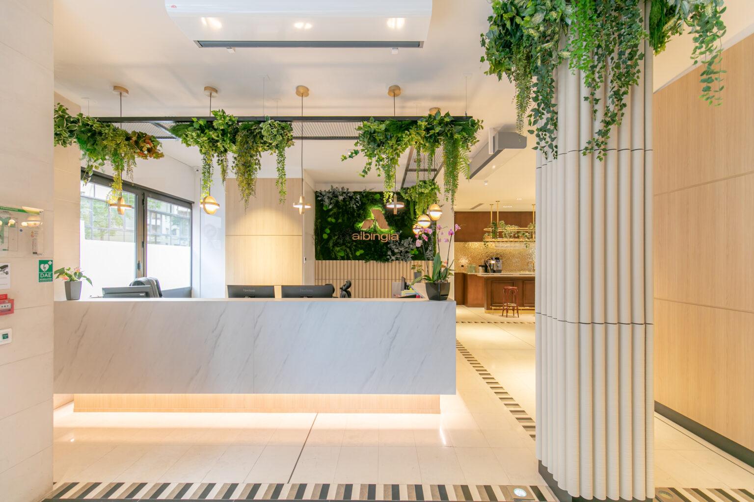 Dès l’entrée, le regard est attiré vers le mur végétal intégrant le logo de l’entreprise. Le comptoir d’accueil en pierre, aux lignes épurées, est mis en valeur par un éclairage subtil en sous-bassement, apportant légèreté et modernité. Le plafond est animé par des plantes tombantes, renforçant la sensation de fraîcheur et de bien-être.