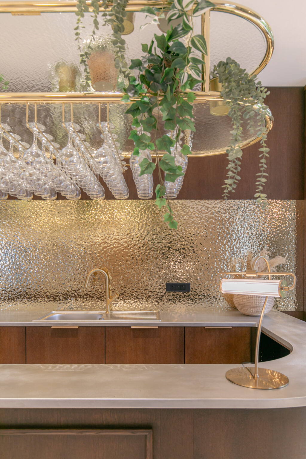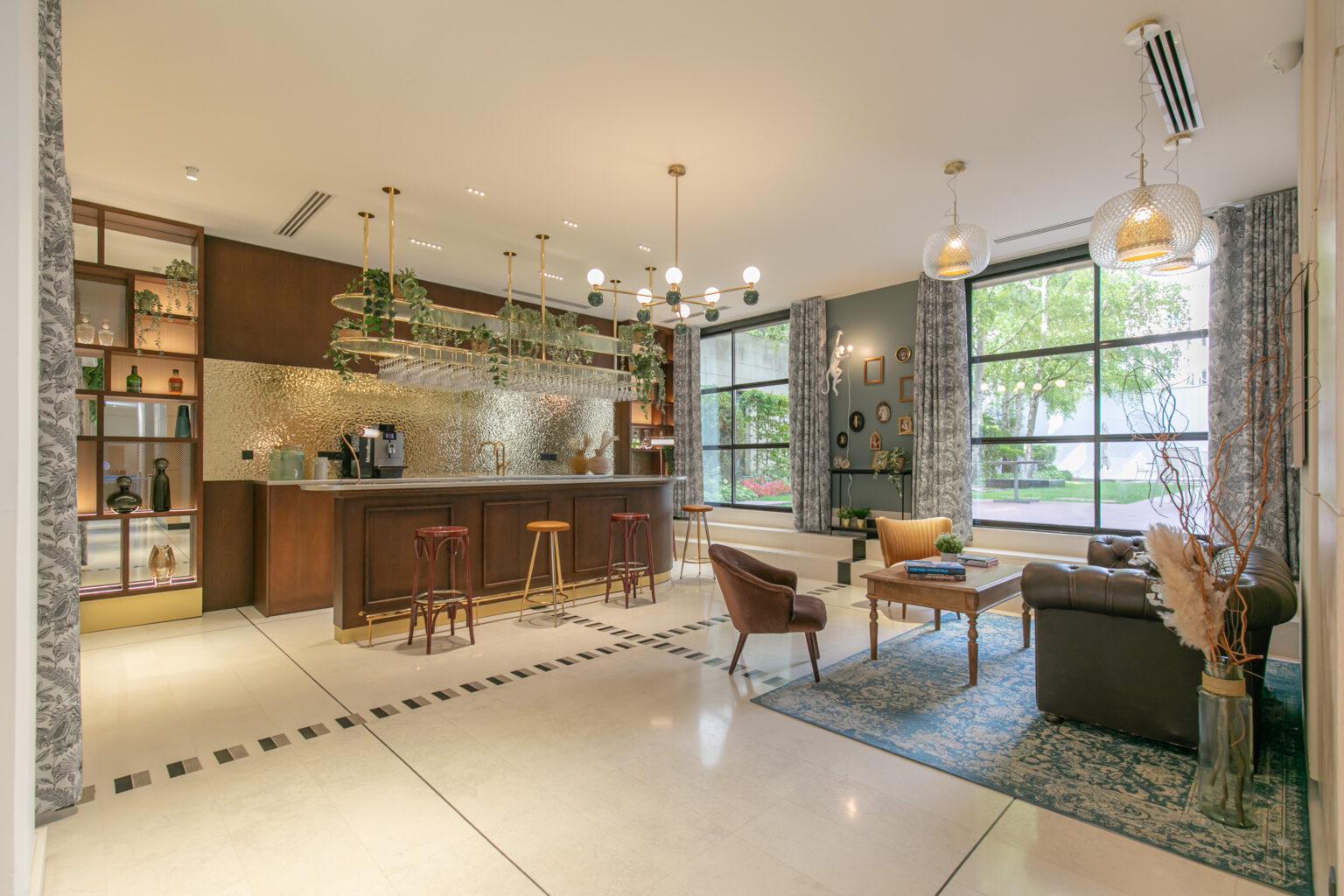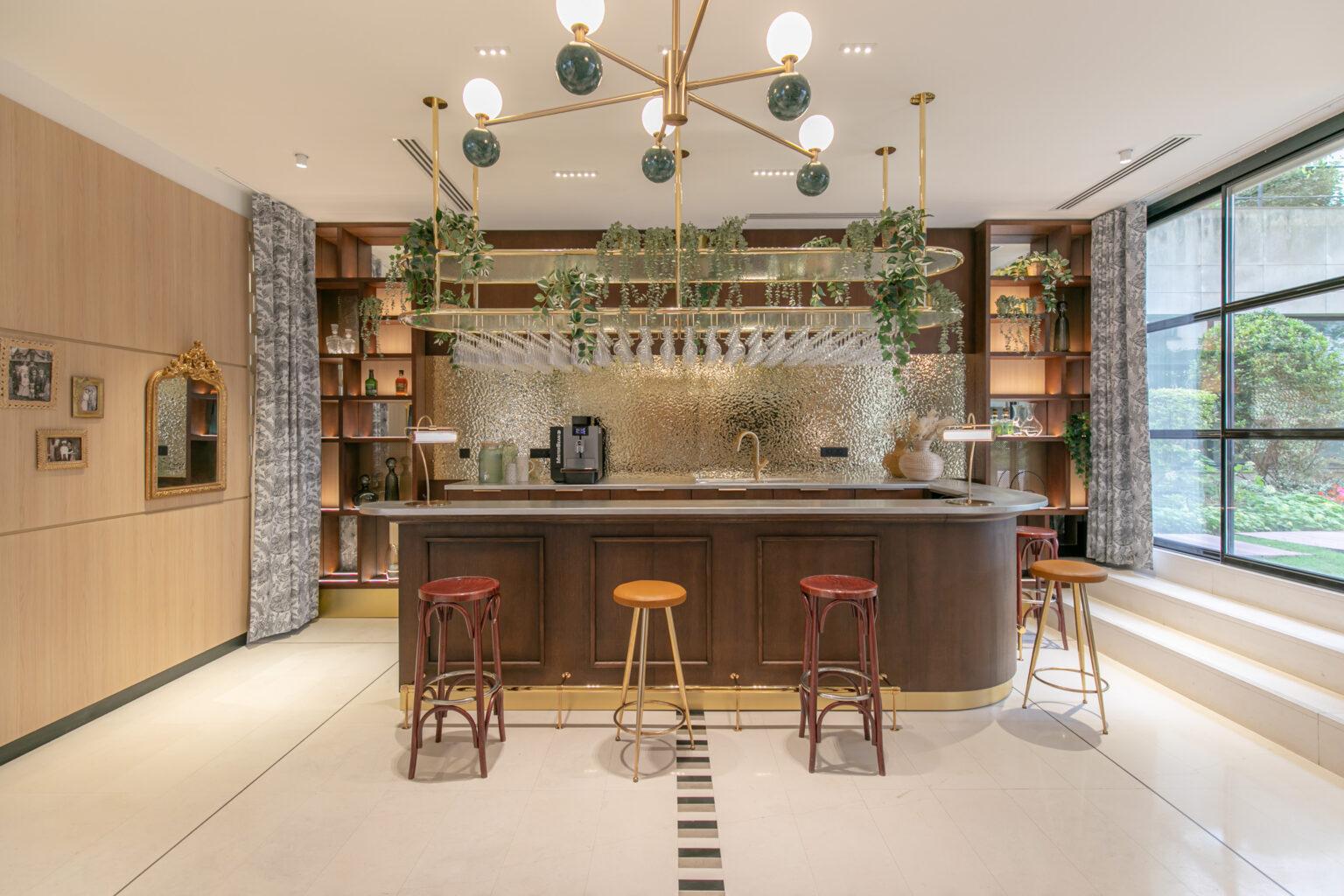Le vaste espace détente est baigné de lumière grâce à d’immenses baies vitrées, et sublimé par sa pièce maîtresse : un bar en bois noble créé sur mesure, habillé d’une crédence dorée martelée, évoquant les codes de l’hôtellerie haut de gamme tout en restant fonctionnel.
