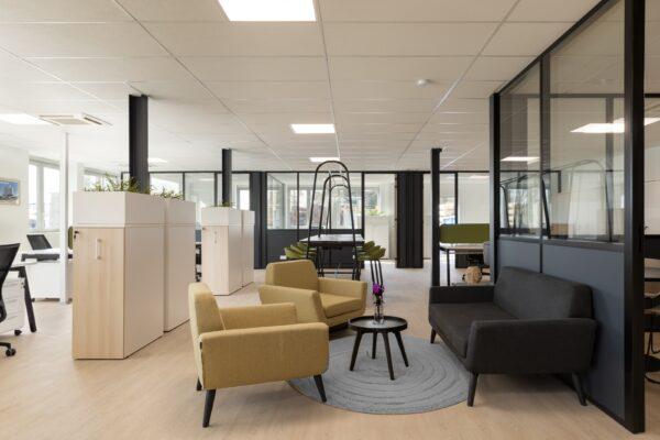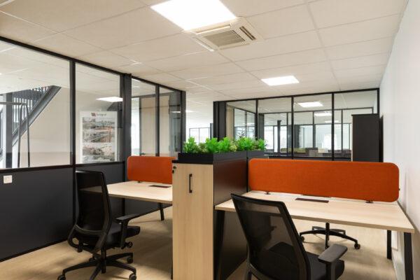Les espaces ont été restructurés à l’aide de cloisons modulaires semi-vitrées gris anthracite, intégrant des portes toute hauteur en placage chêne. La structure métallique existante a été repeinte dans la même teinte afin de créer une harmonie d’ensemble. Le sol en lames PVC effet chêne clair vient contraster avec ces tonalités sombres et apporter de la chaleur aux espaces.