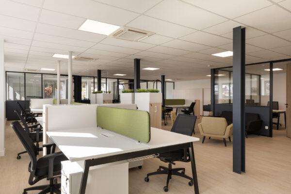 L’aménagement intérieur privilégie des espaces ouverts organisés en open space avec des postes en bench de quatre personnes, complétés par quelques bureaux de direction fermés en périphérie. Des touches de couleur ont été apportées à travers le mobilier et les éléments acoustiques, dynamisant l’ensemble.